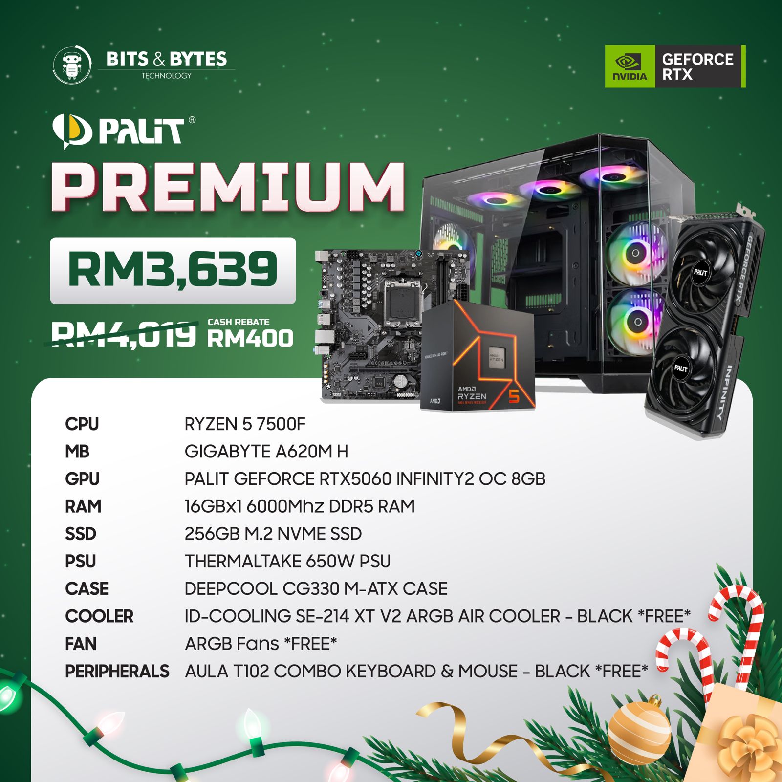 – RYZEN 5 7500F – GIGABYTE A620M H – PALIT GEFORCE RTX5060 INFINITY2 OC 8GB – 16GBx1 6000Mhz DDR5 RAM – 256GB M.2 NVME SSD – THERMALTAKE 650W PSU – DEEPCOOL CG330 M-ATX CASE – ID-COOLING SE-214 XT V2 ARGB AIR COOLER – BLACK FREE GIFT – ARGB Fans FREE GIFT – AULA T102 COMBO KEYBOARD & MOUSE – BLACK FREE GIFT