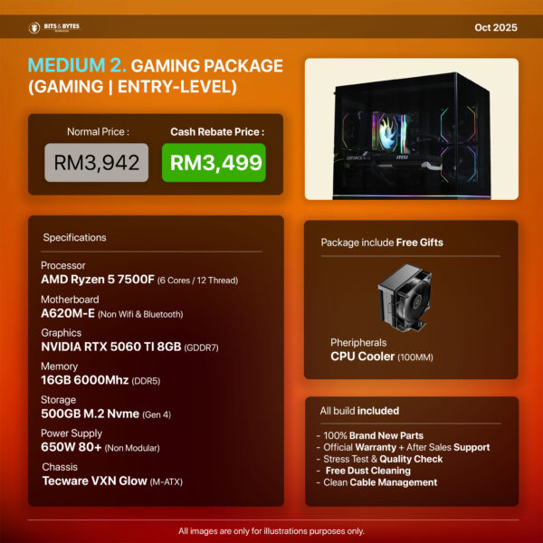 CPU: AMD RYZEN 5 7500F (6 CORE , 12 THREAD) MOBO: MSI/GIGABYTE A620M (NON WIFI & BLUETOOTH) GPU: GEFORCE RTX 5060TI GDDR7 8GB RAM: KINGBANK KRRB Dark Soarblade DDR5 6000MHz 16GB RGB SSD: KINGSTON M.2 NVME 500GB PSU: AIGO AP 650W 80 PLUS CERTIFIED CASE: TECWARE VXN GLOW M TG MATX CASE BLACK COOLER: OCYPUS GAMMA A40 COOLER (FREE GIFT)