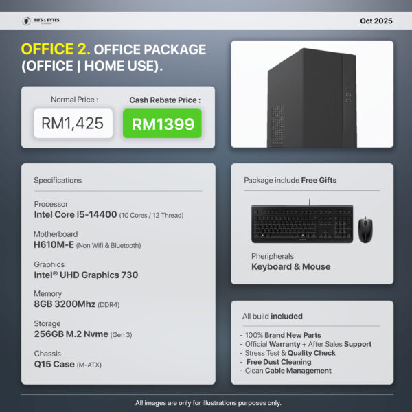 CPU: INTEL CORE I5 14400 (10 CORE , 12 THREAD) MOBO: MSI H610M-E (NON WIFI & BLUETOOTH) GPU: INTEL UHD GRAPHICS 730 RAM: KINGBANK KJXB 3200MHZ 8GB DDR4 WITH HEATSINK (NON-RGB) SSD: ADATA LEGEND 710 256GB M.2 PCIE PSU: INTEGRATED POWER SUPPLY CASE: AIGO Q15 MATX CASING CHERRY DC2000 KEYBOARD & MOUSE (FREE GIFT)
